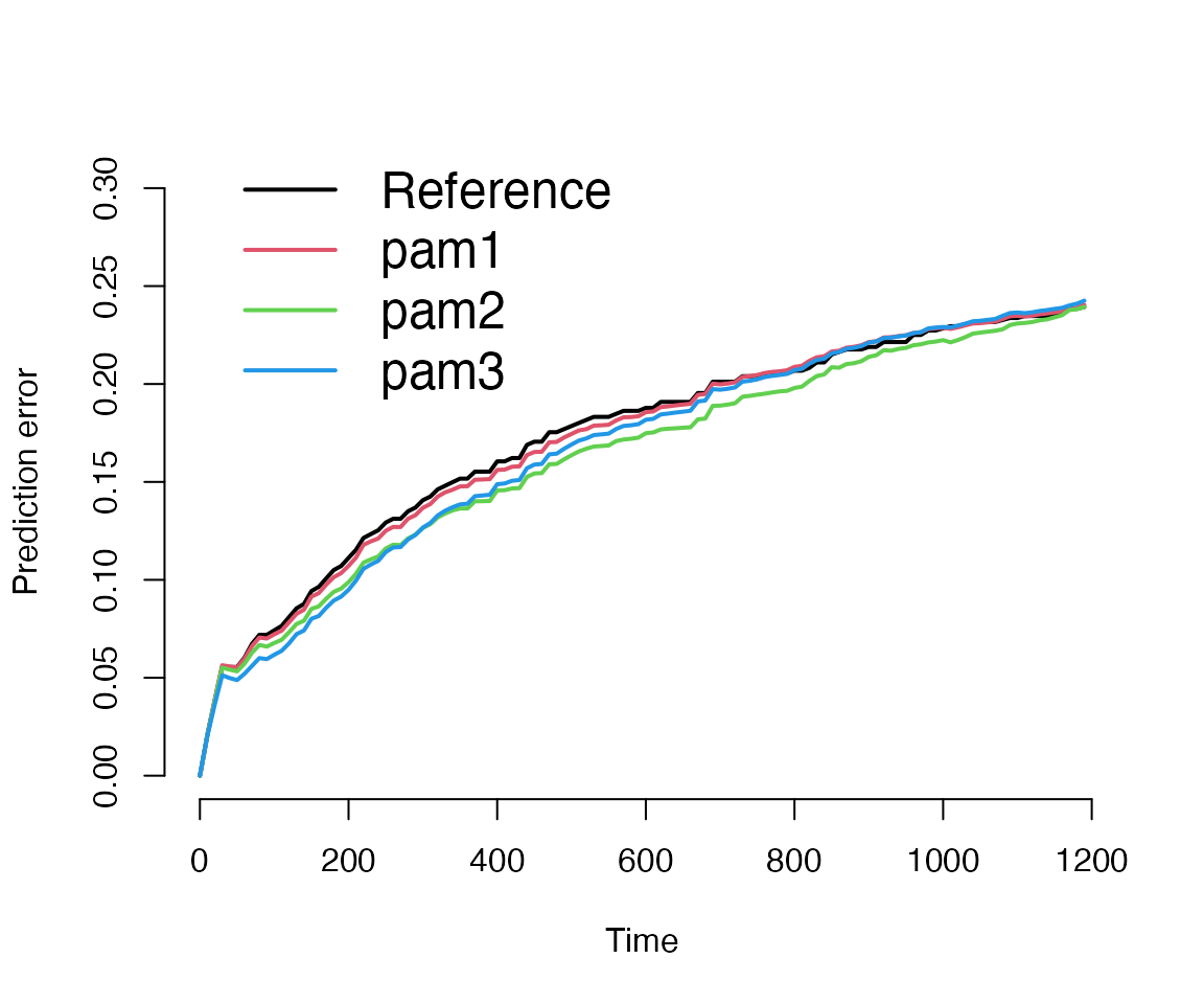 )The results illustrate that no one model is not necessarily better w.r.t. the prediction error for all time-points. For example pam3 is better than pam2 in the beginning and worse towards the end. Similarly, the integrated brier score (IBS) also depends on the evaluation time.
