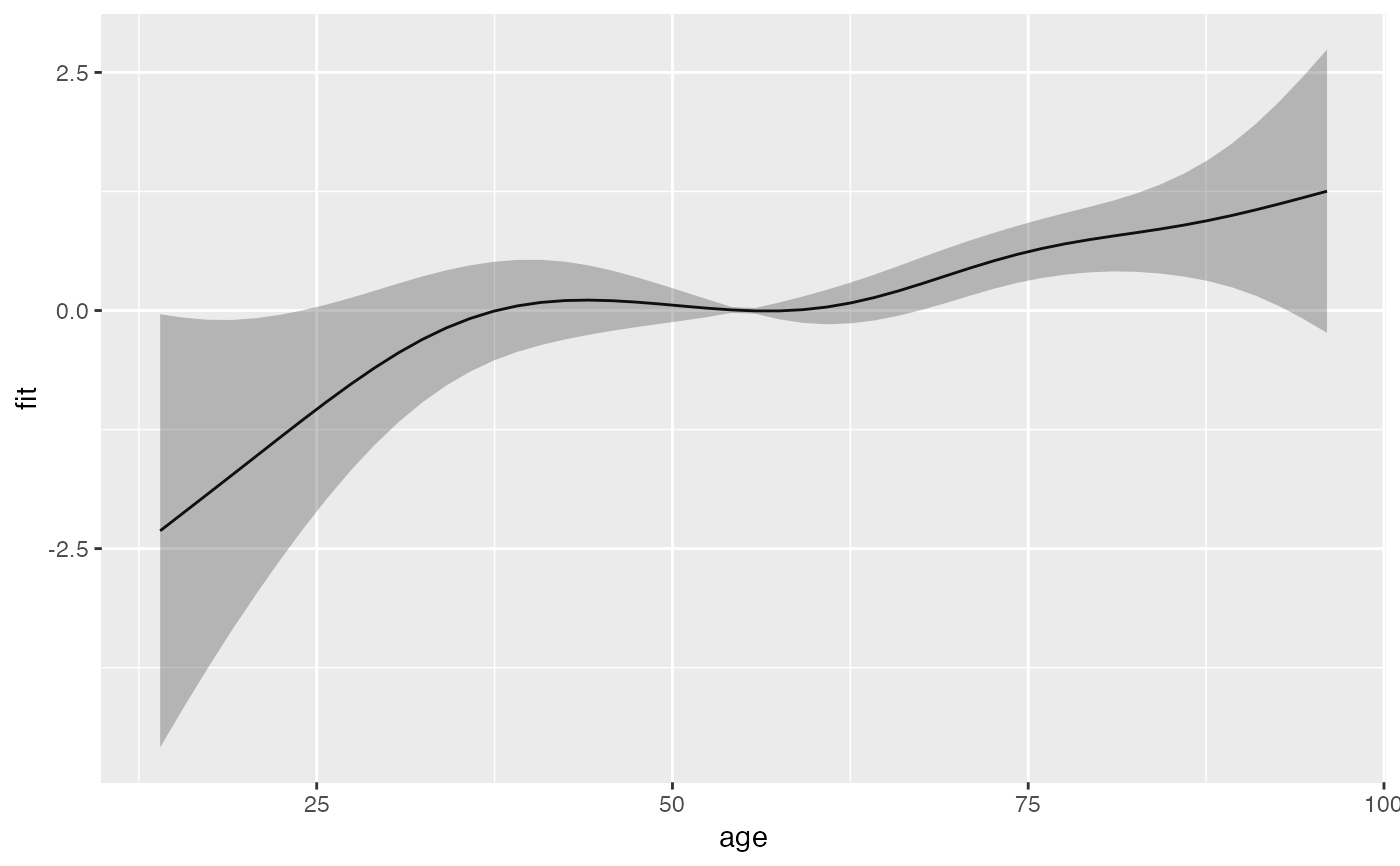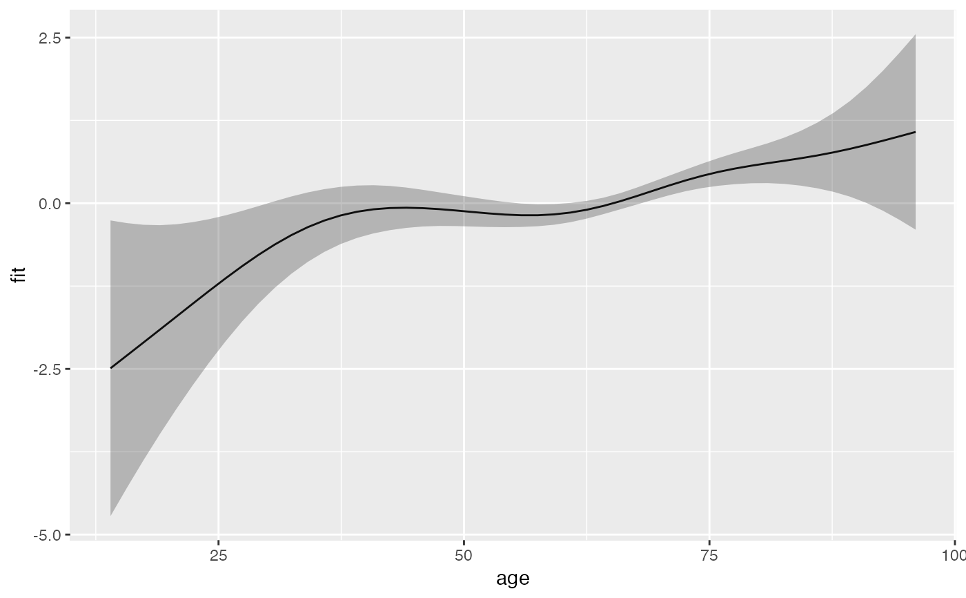 library(ggplot2) ped <- as_ped(tumor, Surv(days, status)~ age, cut = seq(0, 2000, by = 100)) pam <- mgcv::gam(ped_status ~ s(tend) + s(age), family = poisson(), offset = offset, data = ped) #term contribution for sequence of ages s_age <- ped %>% make_newdata(age = seq_range(age, 50)) %>% add_term(pam, term = "age") ggplot(s_age, aes(x = age, y = fit)) + geom_line() + geom_ribbon(aes(ymin = ci_lower, ymax = ci_upper), alpha = .3)# term contribution relative to mean age s_age2 <- ped %>% make_newdata(age = seq_range(age, 50)) %>% add_term(pam, term = "age", reference = list(age = mean(.$age))) ggplot(s_age2, aes(x = age, y = fit)) + geom_line() + geom_ribbon(aes(ymin = ci_lower, ymax = ci_upper), alpha = .3)