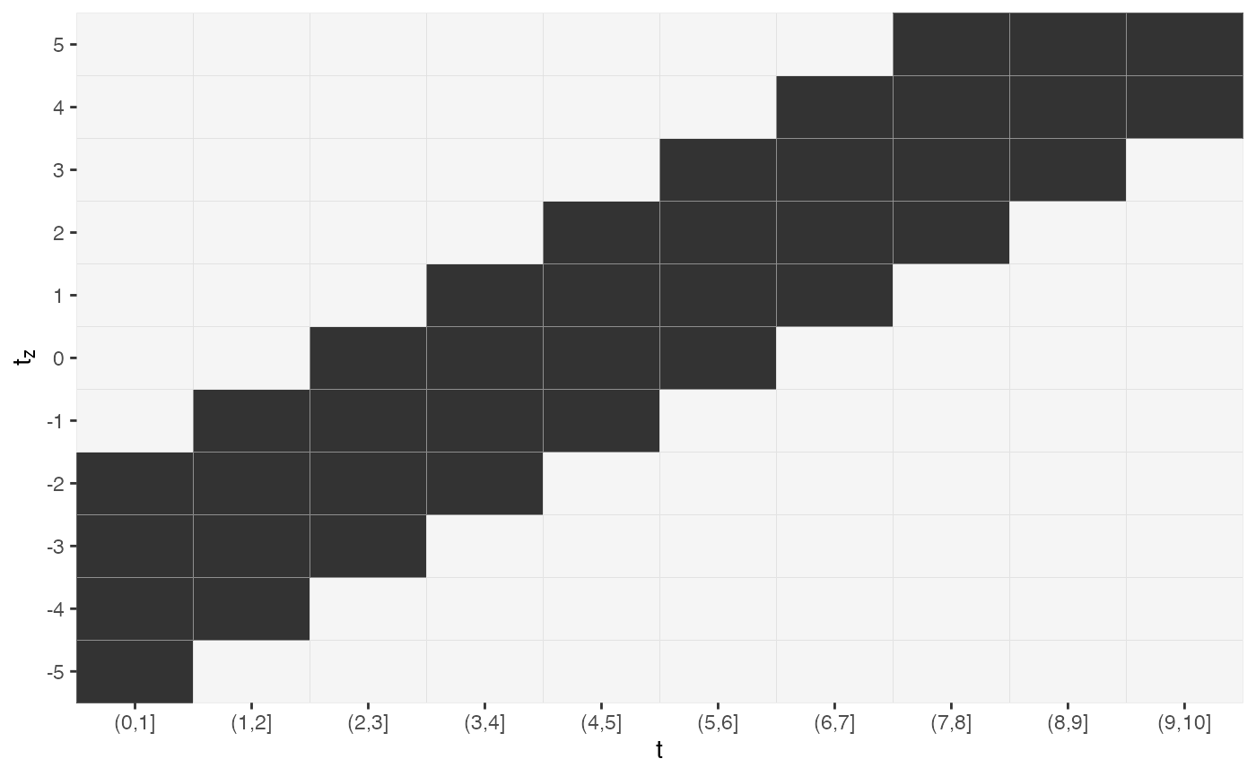 get_laglead(0:10, tz=-5:5, ll_fun=function(t, tz) { t >= tz + 2 & t <= tz + 2 + 3})#> # A tibble: 121 x 3 #> t tz LL #> <int> <int> <dbl> #> 1 0 -5 0 #> 2 0 -4 0 #> 3 0 -3 0 #> 4 0 -2 0 #> 5 0 -1 0 #> 6 0 0 0 #> 7 0 1 0 #> 8 0 2 0 #> 9 0 3 0 #> 10 0 4 0 #> # … with 111 more rows