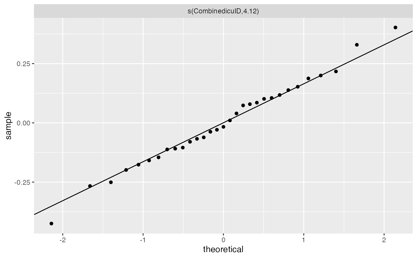 library(pammtools) data("patient") ped <- patient %>% dplyr::slice(1:100) %>% as_ped(Surv(Survdays, PatientDied)~ ApacheIIScore + CombinedicuID, id="CombinedID") pam <- mgcv::gam(ped_status ~ s(tend) + ApacheIIScore + s(CombinedicuID, bs="re"), data=ped, family=poisson(), offset=offset) gg_re(pam)