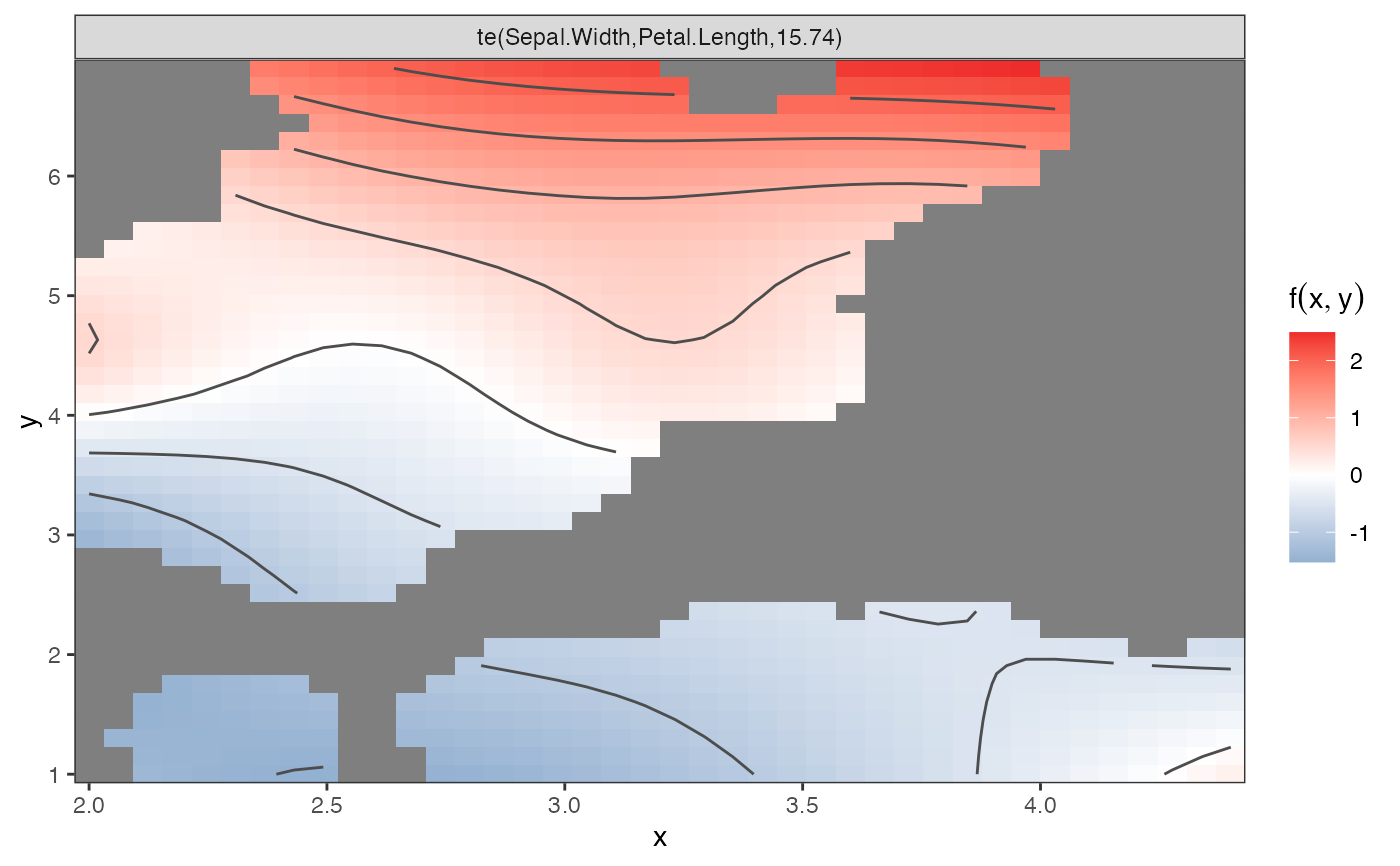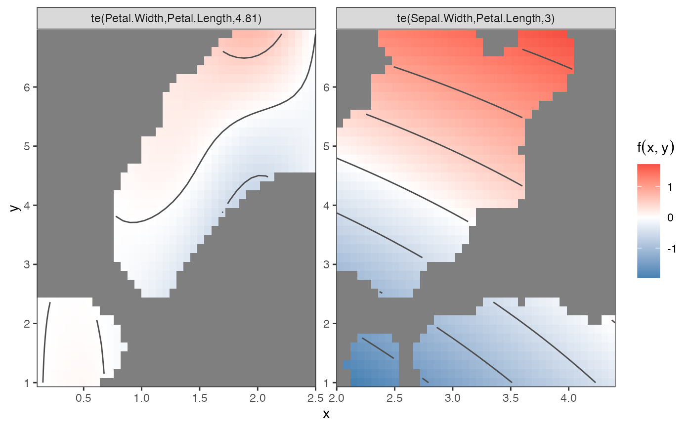 depicting 2d smooth terms specified in the model as heat/contour plots. If